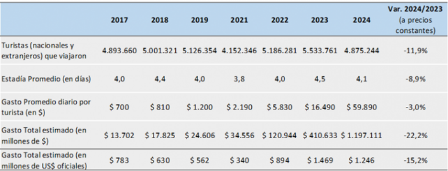 La estadía media bajó de 4,5 días en 2023 a 4,1 este año y el gasto diario en promedio fue de $59.890, que a precios reales (es decir, descontando la inflación) resultó 3% inferior a la temporada pasada.
