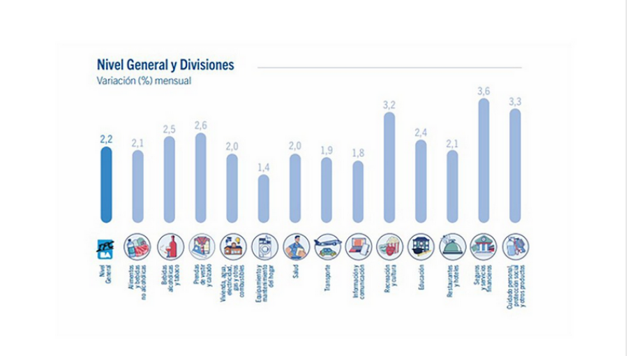 Las divisiones con mayor incidencia en el alza general fueron Vivienda, agua, electricidad, gas y otros combustibles, Alimentos y bebidas no alcohólicas, Restaurantes y hoteles, Transporte y Salud, que en conjunto explicaron 64,8% de la variación total. El Idecba precisó que todas las divisiones aportaron de manera positiva al índice.