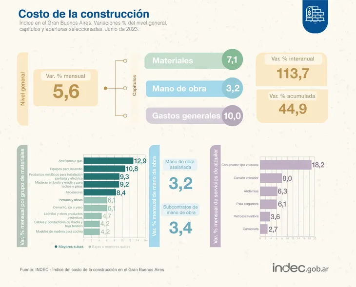 La suba del 44,9% en el Costo de la Construcción durante el primer semestre del año, estuvo impulsada por un alza del 44,9% en los Materiales, del 53,1% en Gastos Generales, mientras que el valor de la Mano de Obra aumentó 43,2%.