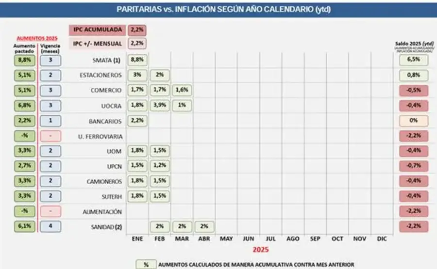 Por lo pronto, y salvo excepciones, en Enero pasado la mayoría de los grandes gremios quedó rezagado en sus aumentos salariales con relación al aumento del índice de comienzos del año (2,2%).