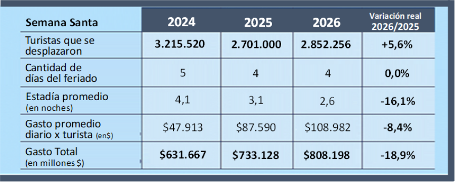 - En comparación con 2025, la cantidad de viajeros creció un 5,6%, mostrando una recuperación moderada de la actividad turística en fechas clave del calendario. Pero a pesar de que más gente viajó, el gasto total descendió un 18,9% anual en términos reales; es decir, descontando el efecto inflación.