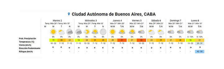 En la Ciudd Autónoma de Buenos Aires (CABA) y alrededores, para este martes, se espera que las máximas ronden los 28°C, mientras que para el miércoles se prevé que los máximos alcancen los 29°. A partir del jueves, el termómetro superará la barrera de los 30 grados, puesto que se espera una máxima de 31°C, subiendo luego a 32°C para el viernes, con mínimas que también reflejarán el ascenso térmico.