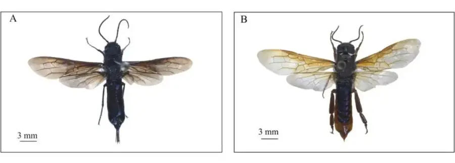 Foto de insectos adultos: hembra (izquierda), macho (derecha). La imagen se encuentra en Wilcken, C.F., da Mota, T.A., de Oliveira, C.H. et al. Sirex obesus (Hymenoptera: Siricidae) as invasive pest in pine plantations in Brazil. Sci Rep 15, 22522 (2025)