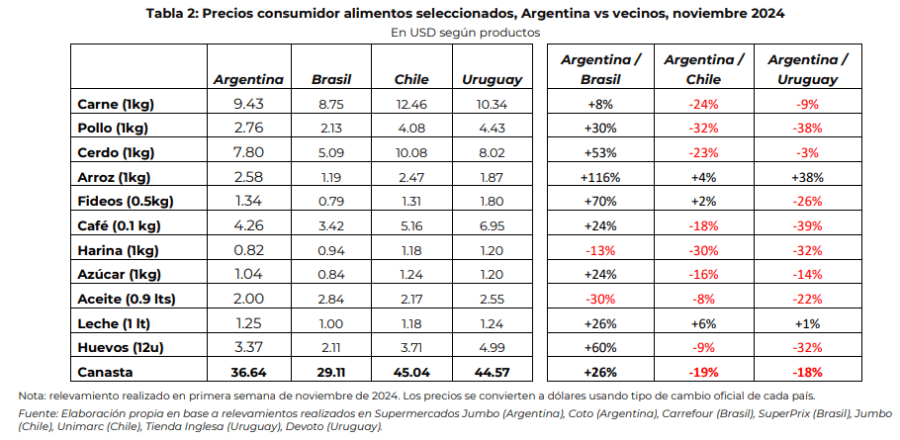 A continuación, relevó sus respectivos precios en los supermercados de cada país en la primera semana de Noviembre 2024 y luego se expresaron todos los precios en dólares utilizando el tipo de cambio oficial de cada país.