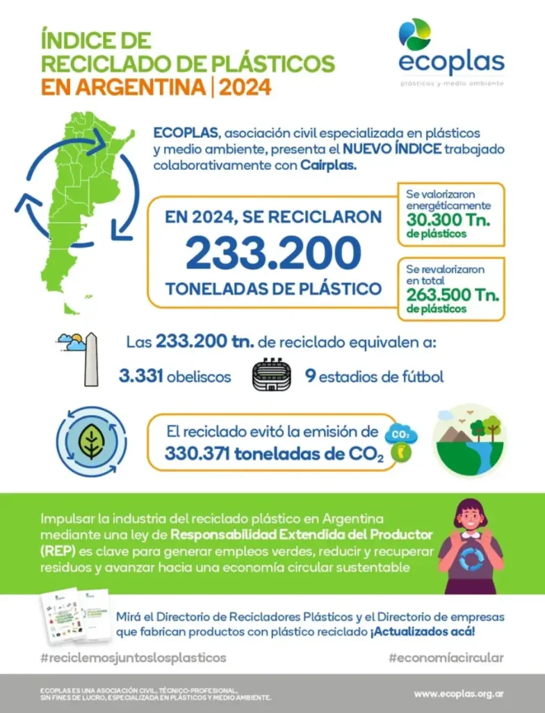 En Argentina se reciclaron mecánicamente 233.200 toneladas de plásticos y se valorizaron energéticamente otras 30.300 en hornos cementeros, durante 2024. Los datos fueron revelados en el último Índice de Reciclado de Plásticos presentado conjuntamente por Ecoplas, la asociación civil especializada en plásticos y medio ambiente, y la Cámara Argentina de Reciclados Plásticos (CAIRPLAS).