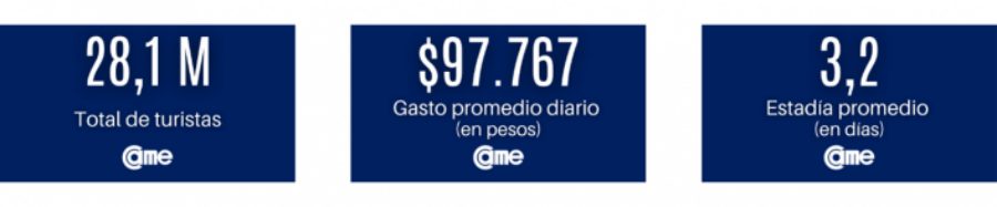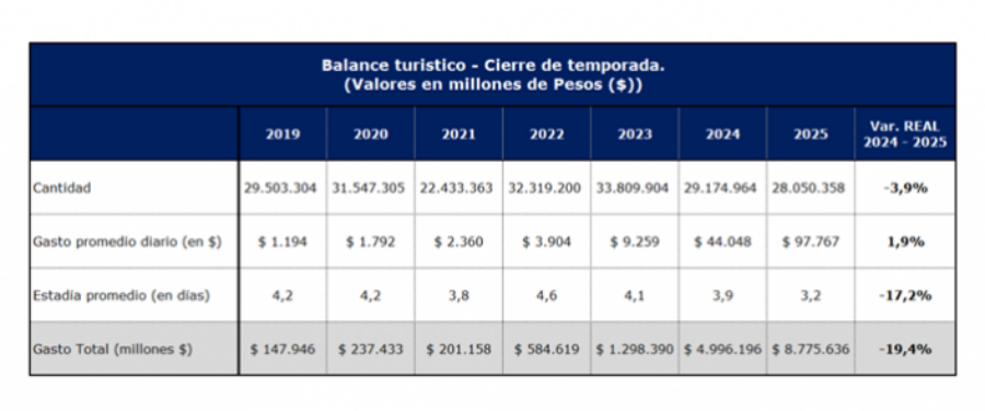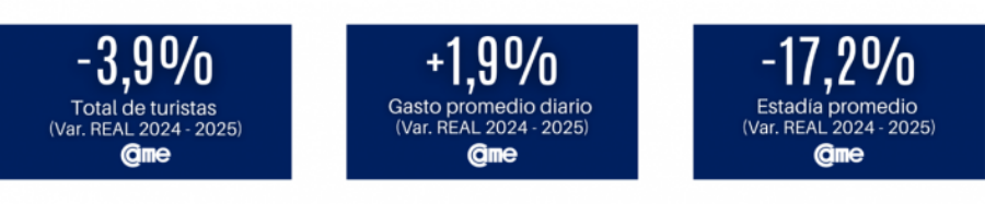 De acuerdo a los datos relevados por el sector Turismo de CAME, la temporada finalizó con 28,1 millones de turistas recorriendo el país, con un impacto económico de 8,7 billones de pesos. Este número representa una caída del 19,4% frente a la temporada 2024. El gasto promedio diario aumentó un 1,9%, mientras que la cantidad de turistas se redujo un 3,9%. La estadía promedio fue de 3,2 días, comparado con los 3,9 días de la temporada anterior. En casi todos los destinos se observó que los turistas, con el objetivo de reducir gastos, optaron por estadías más cortas y un consumo más moderado. A diferencia de otros años, hubo muy pocos turistas internacionales, quienes suelen tener un gasto superior al de los residentes locales.