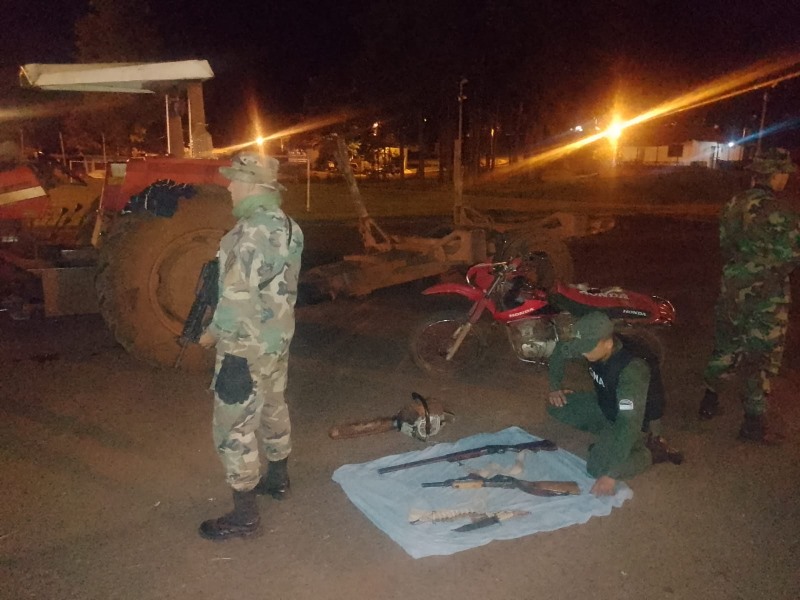 Se dio intervención a Fiscalía Federal y al Juzgado Federal de la ciudad de la ciudad de Eldorado (Misiones), quienes ordenaron la incautación de una escopeta calibre 20, con diez cartuchos del mismo calibre, una carabina calibre 16, sin cartuchos, un cuchillo, un acoplado, un tractor, una motosierra y todo tipo de elemento de interés para la causa; que se labren las actuaciones de rigor, quedando los masculinos supeditados a la causa.