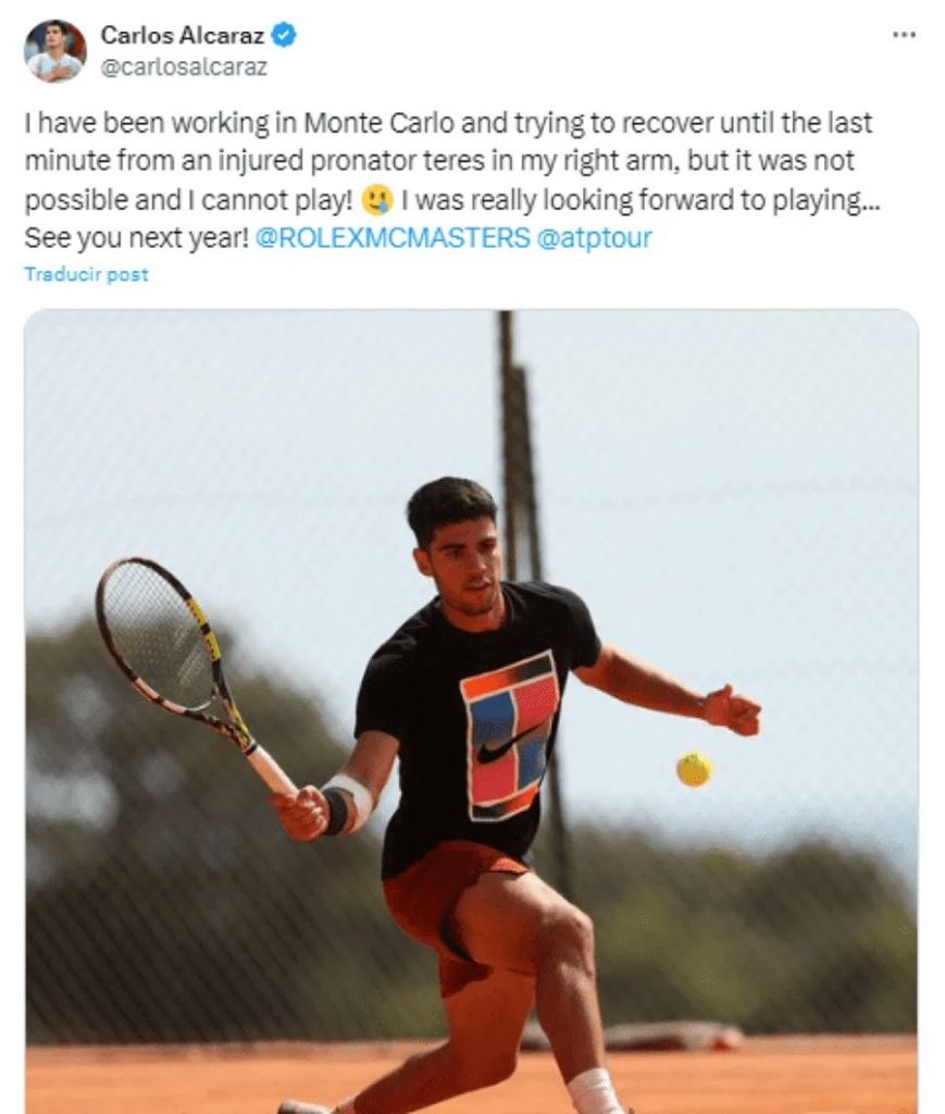 "He estado trabajando en Montecarlo e intentando recuperarme hasta el último momento de una lesión en el pronador redondo del brazo derecho, pero no ha sido posible y no puedo jugar. Tenía muchas ganas de jugar…. ¡Nos vemos el año que viene!", informó Alcaraz el martes.