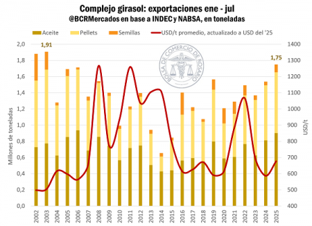 Esto potenció tanto los precios como los volúmenes embarcados: hasta julio, Argentina exportó 900.000 toneladas de aceite de girasol, el mayor registro desde 2006.