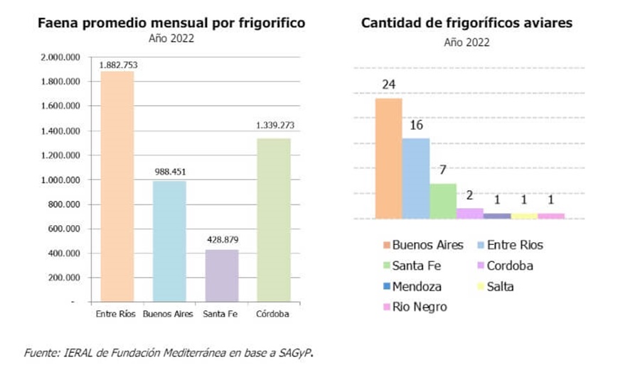 El año pasado, la faena aviar fue de 734,5 millones de cabezas, un 1,6% más en relación a 2022. El 51,3% del total de pollos se faenó en Entre Ríos (376,7 millones de cabezas) y el 35,1% en territorio bonaerense, unas 257,7 millones de cabezas).