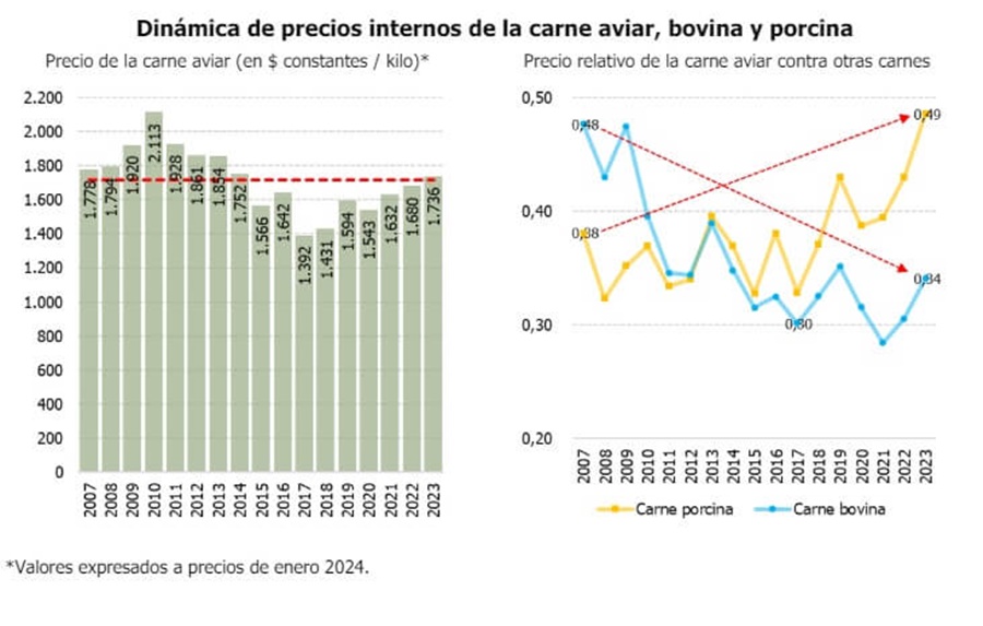 En relación a la dinámica de los precios internos, la carne aviar promedió los $1.778 por kilo en 2023, un aumento interanual del 3,3%.