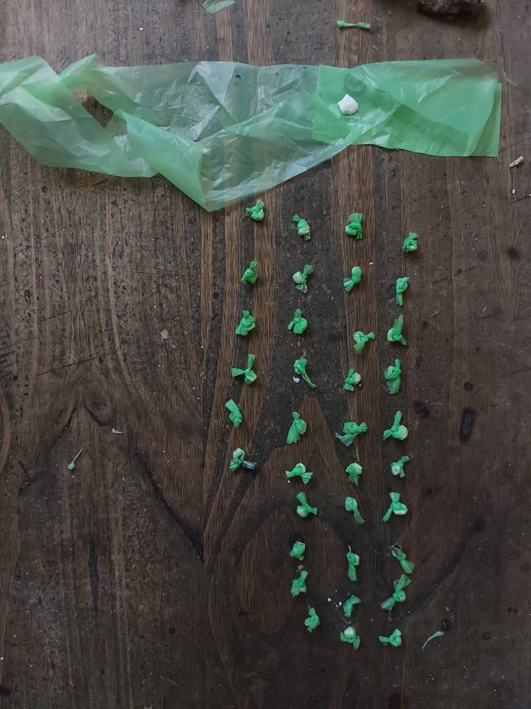 Ante la presencia de testigos, se requisó en forma minuciosa el lugar, observando en el sector del almacén envoltorios de nylón, dentro de los cuales se encontró una sustancia pulverulenta de color blanco. Asimismo, dentro de las cañerías de desagüe se pudo constatar más envoltorios de las mismas características, razón por la cual el personal procedió al desmantelamiento del mismo, totalizando 37 “bochitas” sobre las cuales se practicaron test químicos de campo, los cuales arrojaron resultado positivo para “clorhidrato de cocaína”.