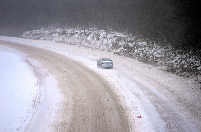 Un coche circula lentamente por una carretera interestatal cubierta de nieve el domingo 5 de enero de 2025, en San Luis. (AP Foto/Jeff Roberson)