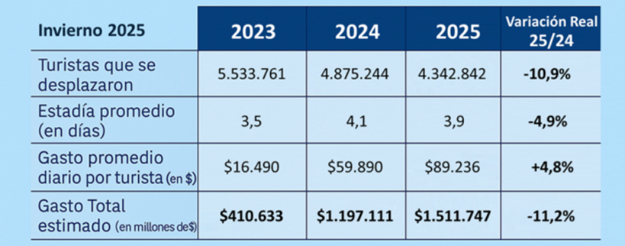 Las vacaciones de invierno sintieron la caída en el poder adquisitivo familiar, la pérdida de competitividad cambiaria y un clima más frio y lluvioso de lo habitual. En ese contexto, viajaron 4,3 millones de personas por el país, 10,9% menos que el año pasado, y gastaron 1,5 billones de pesos (1.163 millones de dólares) en las ciudades que integran el circuito turístico nacional. El impacto económico fue un 11,2% menor a 2024, medido a precios constantes.