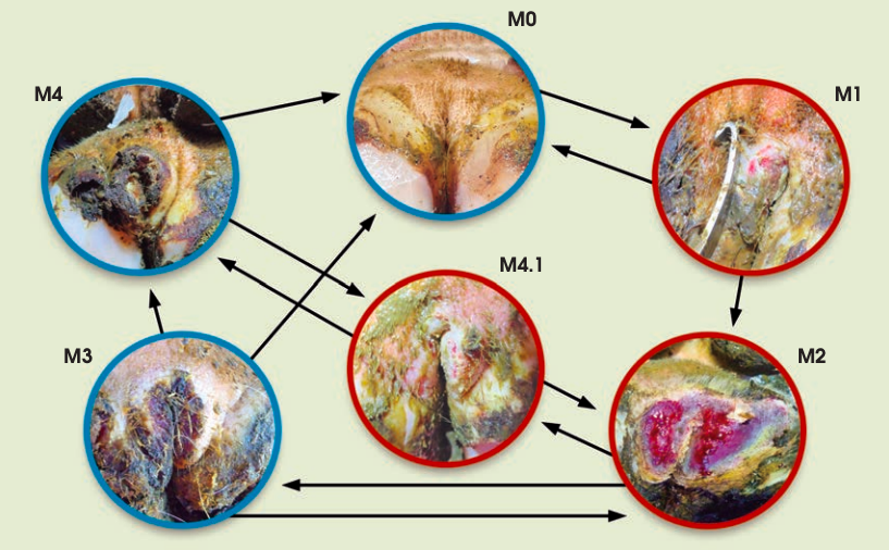 Normalmente en las lesiones se encuentran diferentes especies de treponema actuando a la vez, siendo la T. phagedenis la que se encuentra en todos los estadios clínicos de la lesión. Este tipo de lesiones se clasifican en estadios o fases, siendo la escala M descrita por C. Mortellaro en el 1974 la más utilizada actualmente. Esta escala ha sido actualizada en diferentes ocasiones. A día de hoy se describen 5 puntos o incluso 6 según algunos autores.