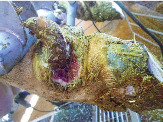 Es importante tener claro que la piel es la primera barrera física y de defensa que evita la entrada de organismos patógenos que van a generar infecciones. Se debe tener en cuenta que el acúmulo de purín en la piel genera irritación y como consecuencia se generan pequeñas lesiones o grietas que afectan a la integridad normal de esta. Así, se debe intentar que los animales estén en un ambiente lo más limpio posible, evitando que el purín se acumule en las extremidades. Pero no solo el purín es un factor irritante de la piel, el exceso de humedad en la piel también afectará a la integridad de la misma.