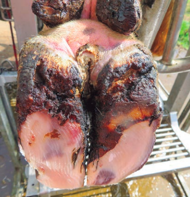 - Estado M2: Estado clínico de la lesión. Se observa una lesión ulcerativa y de color rojizo muy dolorosa que presenta un olor muy característico. Esta lesión es muy dolorosa y produce una cojera evidente.