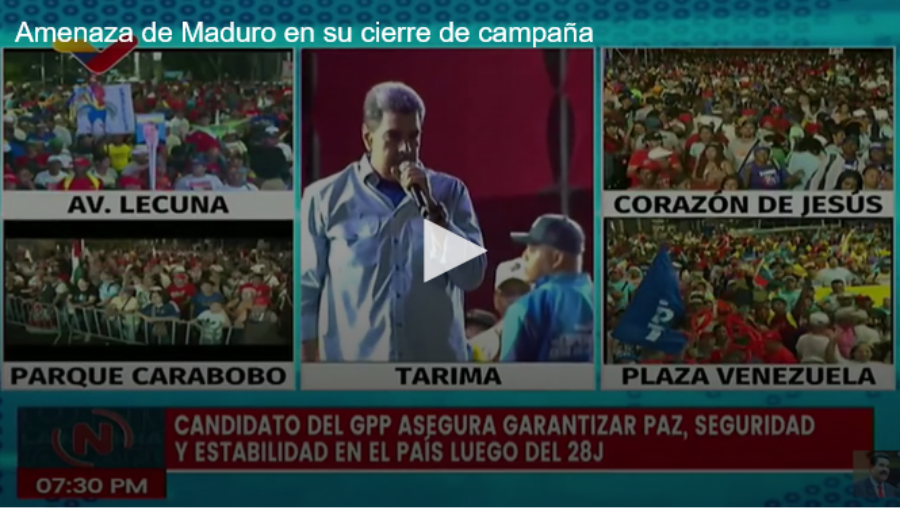 Nicolás Maduro cerró el día jueves su campaña presidencial, a tres días de los comicios en Venezuela, con un acto en la avenida Bolívar de Caracas y una amenaza a la oposición. “No le vamos a permitir que sigan haciendo daño, se les acabó el tiempo”, dijo, y afirmó: “Habrá mano de hierro y justicia para los fascistas y violentos”.