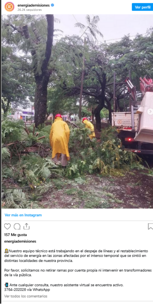 La Presidente de Energía de Misiones, Virginia Kluka, destacó la inmediata y coordinada respuesta de la empresa para mitigar los efectos de la tormenta y restaurar el suministro eléctrico a la mayor brevedad posible.