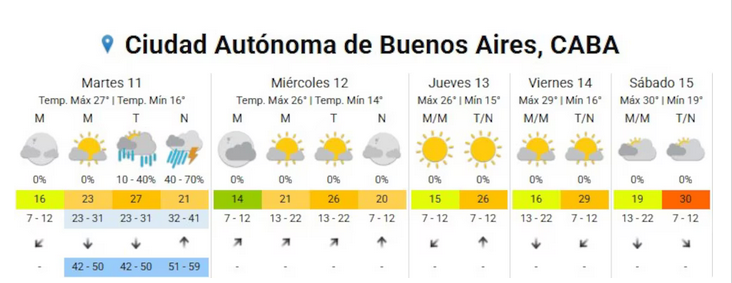 De acuerdo con la información oficial, el mal tiempo será pasajero. El miércoles se espera un repunte en las condiciones, con cielo parcialmente nublado por la madrugada y algo nublado durante el resto del día. No se prevén lluvias ni tormentas. Las temperaturas se mantendrán entre los 14 y 26 grados, acompañadas de vientos del sector este. El pronóstico extendido del SMN no muestra nuevas precipitaciones durante los próximos días.