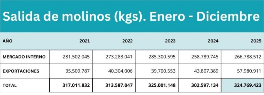 Los envases de medio kilo mantuvieron la preferencia de los consumidores. Durante el mes de diciembre de 2025 los paquetes de medio kilo representaron el 55, 14% de las salidas de molinos al mercado interno.