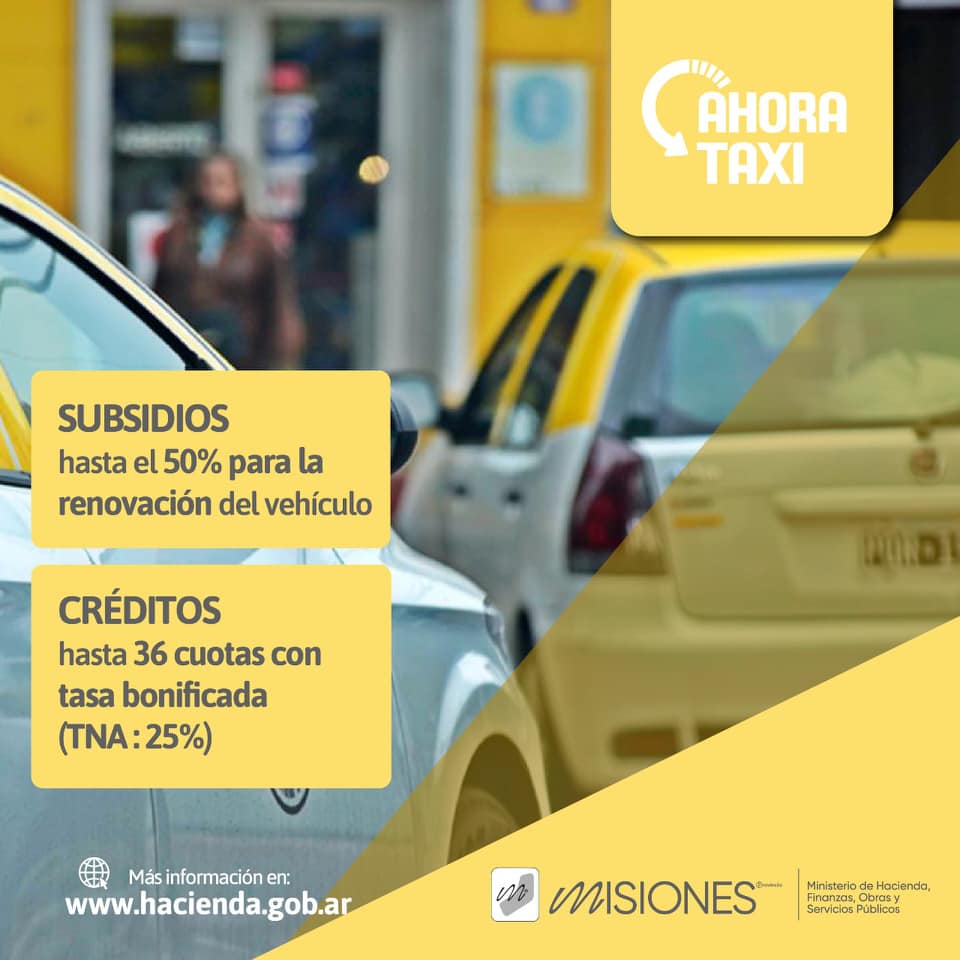 "Ahora Taxi es una herramienta impulsada por el Gobierno de Misiones destinada a acompañar al sector en la renovación de unidades. Mediante un acuerdo con la Terminal Fabricante Fiat, el programa subsidia hasta el 50% del valor de un vehículo Fiat Cronos (incluyendo la pintura identificatoria) con el compromiso de la concesionaria de tomar el vehículo usado como parte de pago".