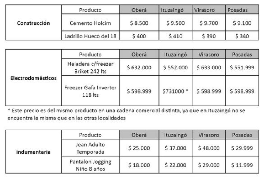 "Uno de los argumentos para explicar en contexto las diferencias de precios se refiere al costo del flete y la incidencia de los valores altos del combustible en la provincia de Misiones. Si tenemos en cuenta que las localidades de Posadas y Oberá se encuentran entre 100 y 150 km más al norte que las localidades de Ituzaingó o Gobernador Virasoro, deberíamos observar un impacto en el precio de los productos incluidos en el relevamiento, debido al mayor costo de flete. Sin embargo, es remarcable que los comercios de las localidades misioneras buscan estrategias competitivas a fin de no trasladar al consumidor un precio mayor".