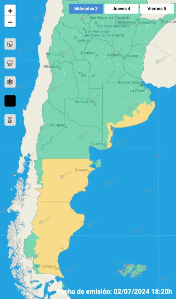 Se trata de un alerta amarillo que rige, junto a zonas de Buenos Aires, a otras de las provincias de Chubut y Santa Cruz. En paralelo, rige una advertencia amarilla por nieve para tres distritos: Chubut, Santa Cruz y Tierra del Fuego.