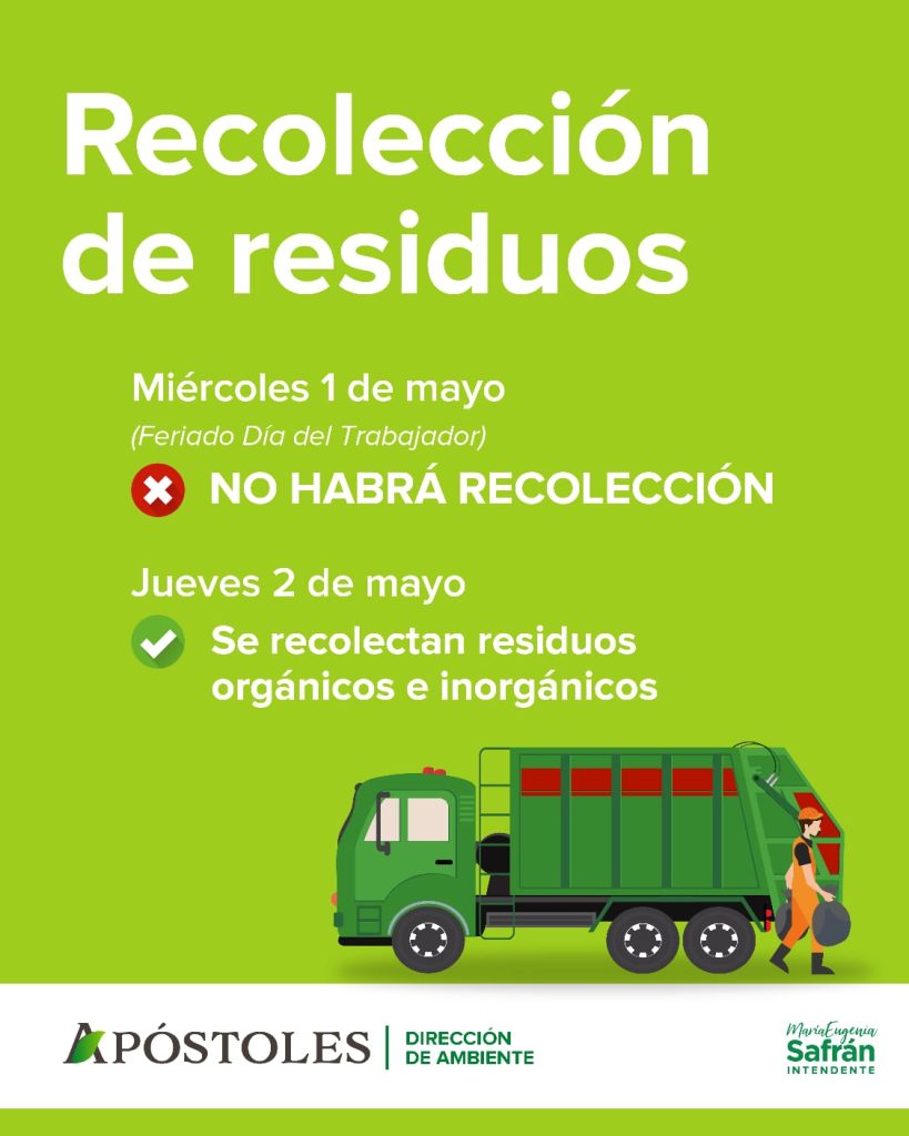 Apóstoles: Durante el Día del Trabajador no habrá recolección de residuos domiciliarios, las labores serán retomadas en toda la ciudad el día jueves 2 de Mayo con residuos orgánicos e inorgánicos