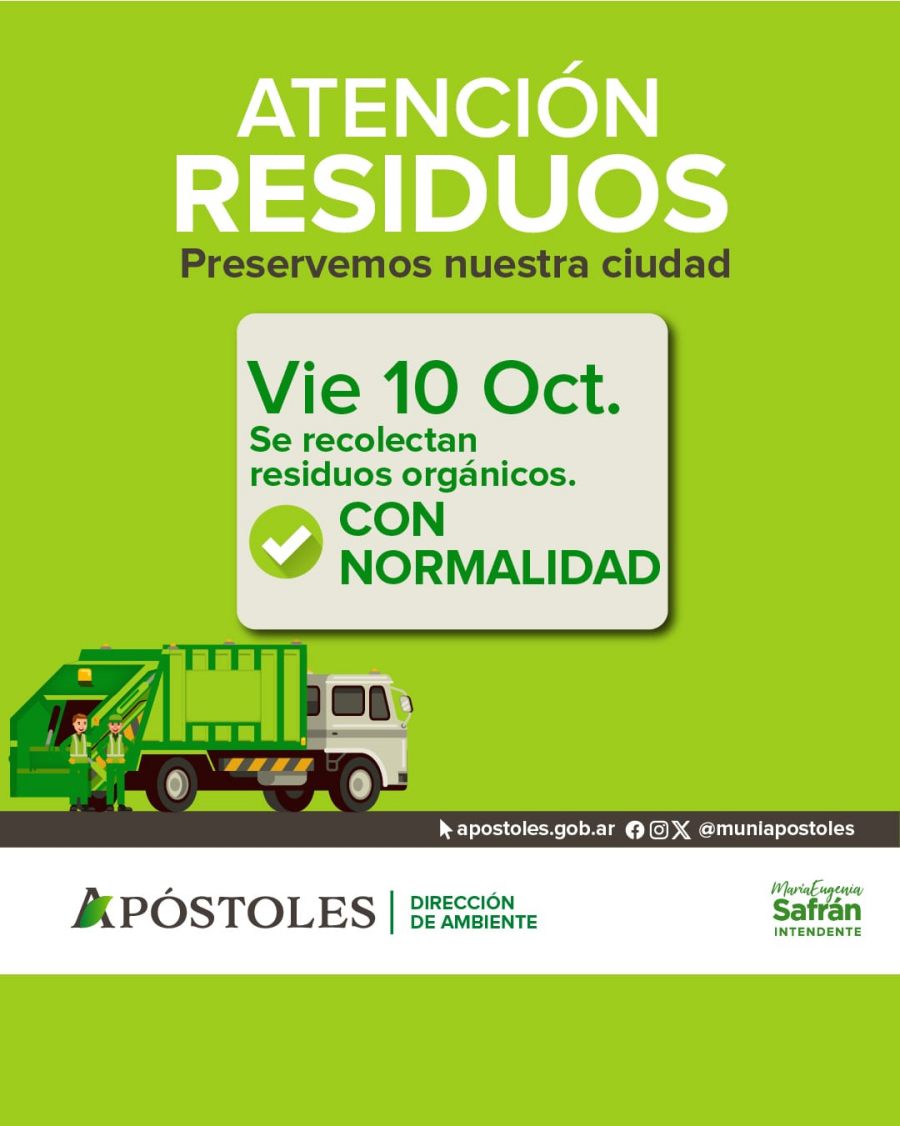 Apóstoles: Durante el feriado, del día viernes 10 de Octubre, la recolección de residuos domiciliarios orgánicos, se realizará con total normalidad