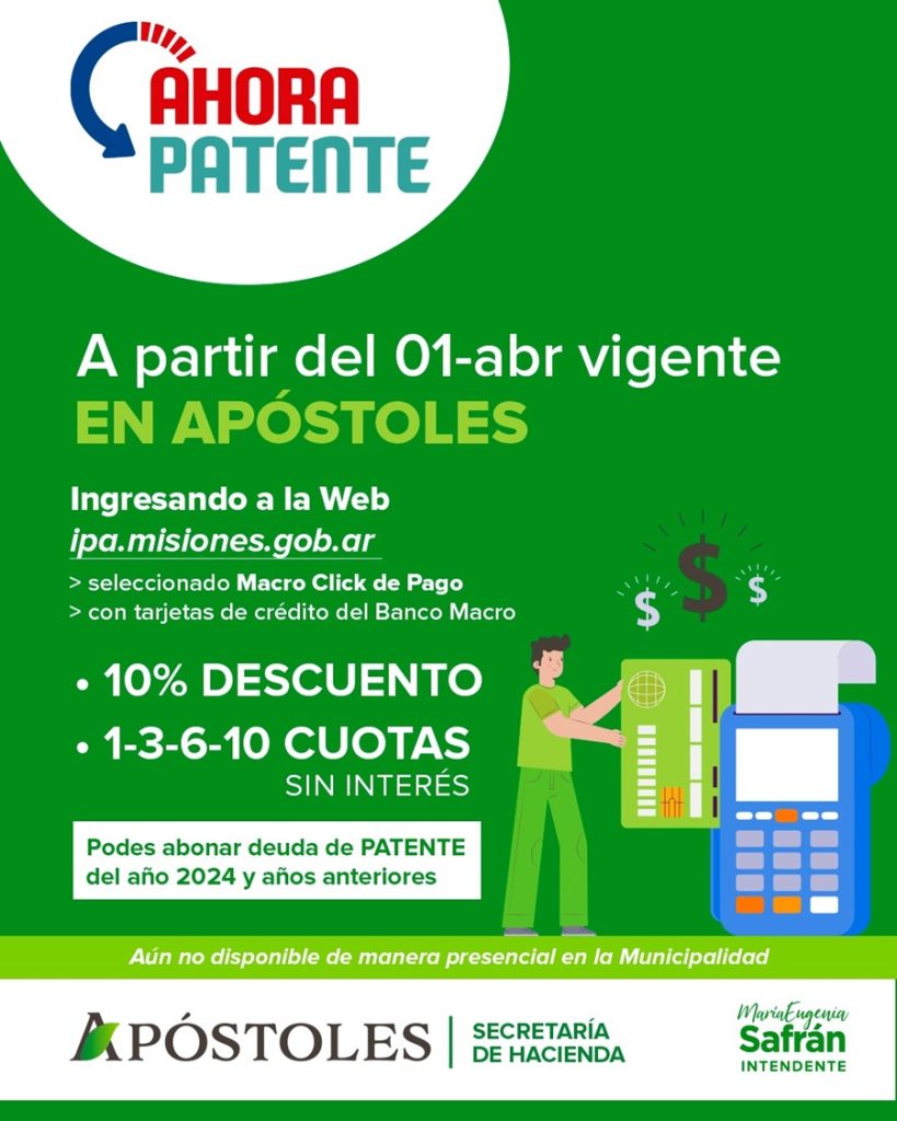 Apóstoles: El Programa Provincial Ahora patente vía online vigente desde el 1° de Abril, hasta en 10 cuotas sin intereses y con el reintegro del 10% abonando con la tarjeta de crédito del Banco Macro