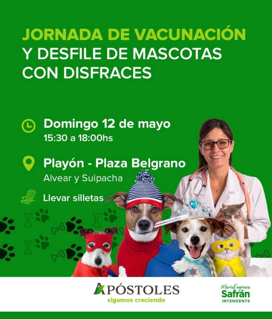 La Municipalidad de Apóstoles invita a toda la comunidad a celebrar el Día del Animal con las mascotas que tenemos en casa y forman parte del día a día de nuestras familias, por tal motivo se realizará la Jornada Abierta de Vacunación, totalmente gratuita y Desfile de Mascotas con Disfraces donde habrá premios para ganadores y participantes, recordamos que este evento fue reprogramado con respecto a su fecha original por cuestiones climáticas.