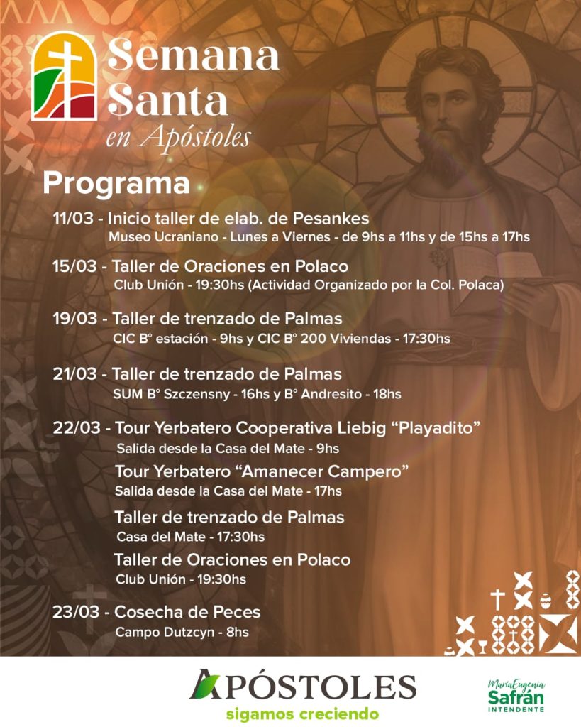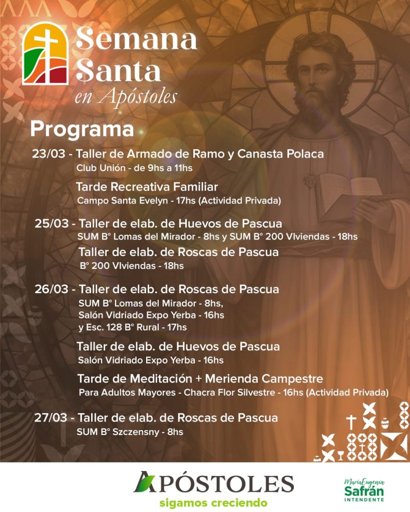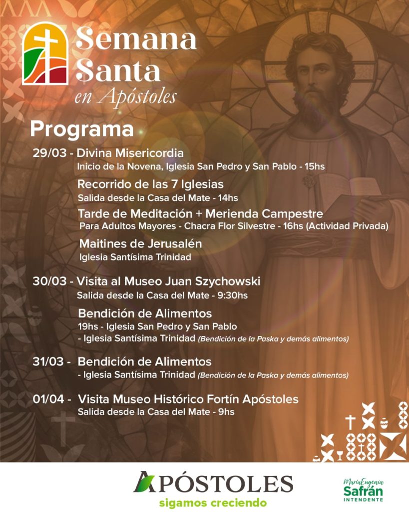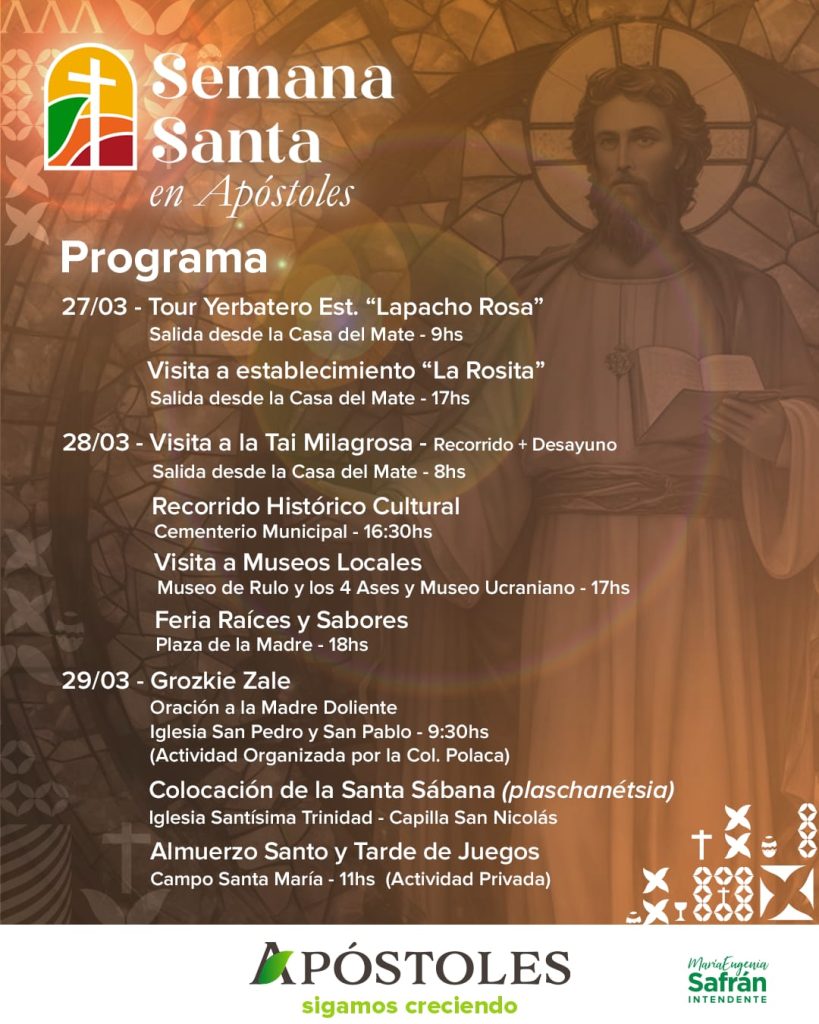 Ante la inminente llegada del periodo más sagrado del calendario litúrgico, la Municipalidad de la ciudad misionera de Apóstoles presenta una nutrida y variada agenda turística y cultural conjuntamente con instituciones religiosas y privadas hacen de esta celebración, una de las más importantes de la comunidad en la Capital Provincial de la Semana Santa y el Pesanké.