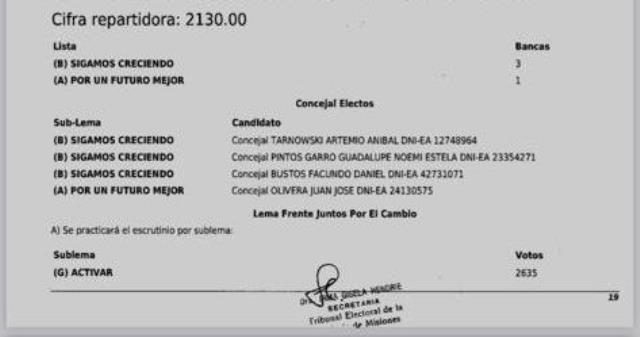 Luego del recuento definitivos de los votos de las elecciones del 7 de Mayo en la ciudad de Apóstoles y según la “cifra repartidora”, el Sublema “Sigamos Creciendo” que llevó a la reelección a la Contadora, María Eugenia Safrán, sumó tres Concejales; el Médico Pediatra, Artemio Aníbal Tarnowski, la Profesora, Guadalupe Noemí Estela Pintos Garro y el Joven Deportista, Facundo Daniel Bustos.