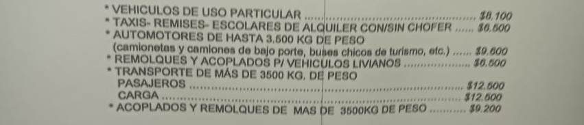 Automotores de hasta 3.600 kilos de peso (camionetas y camiones de bajo porte, buses chicos de turismo, etc.) – 9.600 pesos