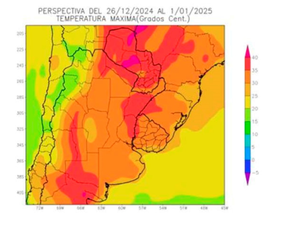 Los vientos del Trópico retornarán rápidamente, provocando temperaturas máximas sobre lo normal en la mayor parte del área agrícola días previos al último día del año, con registros extremos sobre su porción norte, y sólo el Litoral Atlántico experimentará registros más cercanos a la media gracias a la entrada de vientos marinos.