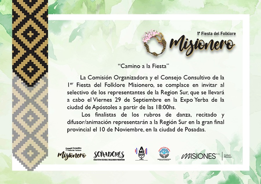 Este viernes, desde las 18,00 en la ciudad misionera de Apóstoles elegirá las categorías de danza, recitador y difusor/animador a los representantes de la Región Sur. Los ganadores participarán en la gran final provincial del 10 de Noviembre, en la ciudad de Posadas.