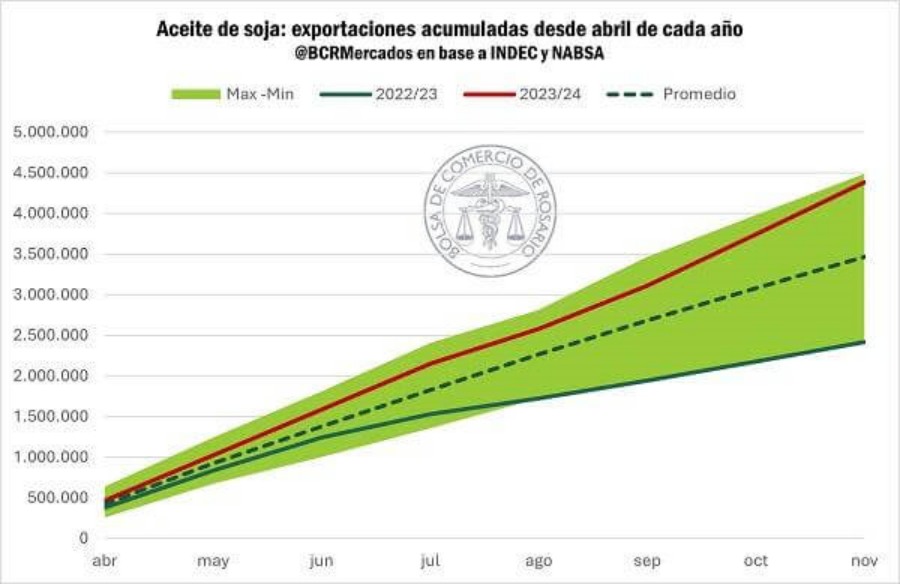 Con esos números, en el acumulado del año, entre enero y noviembre se llevarían embarcadas 4,4 millones de toneladas de aceite de soja, volumen que se posiciona en el top 3 para el complejo oleaginoso.