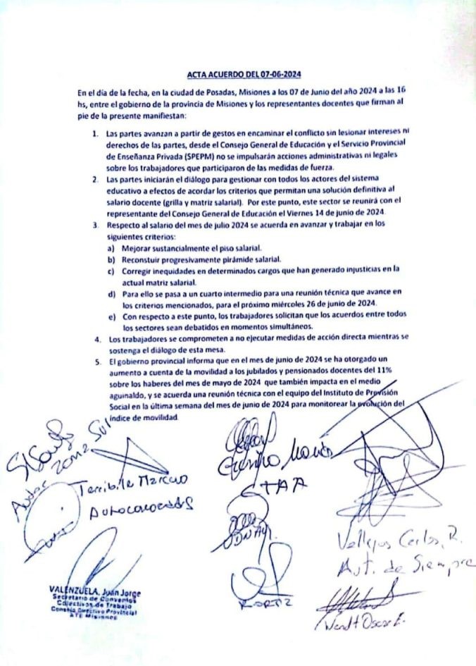 Los alcances de ese acuerdo son la no sanciones administrativas ni legales contra los docentes en lucha, avanzar en una Mesa Técnica para la discusión de la grilla salarial el 14 de Junio, la discusión en una Mesa Técnica para el 26 de Junio a fin de discutir incremento de Julio haciendo hincapié en la necesidad de continuar avanzando sobre aumento de piso, corrección de pirámide de antigüedad e inequidades entre cargos.