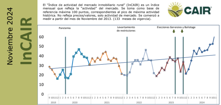 Un parámetro es el Índice de Actividad del Mercado Inmobiliario Rural (Incair) que elabora mensualmente la Cámara Argentina de Inmobiliarias Rurales (CAIR) y que el mes pasado se ubicó en 65,9 puntos, el valor más alto desde que este indicador comenzó a elaborarse, que fue en Noviembre de 2013.
