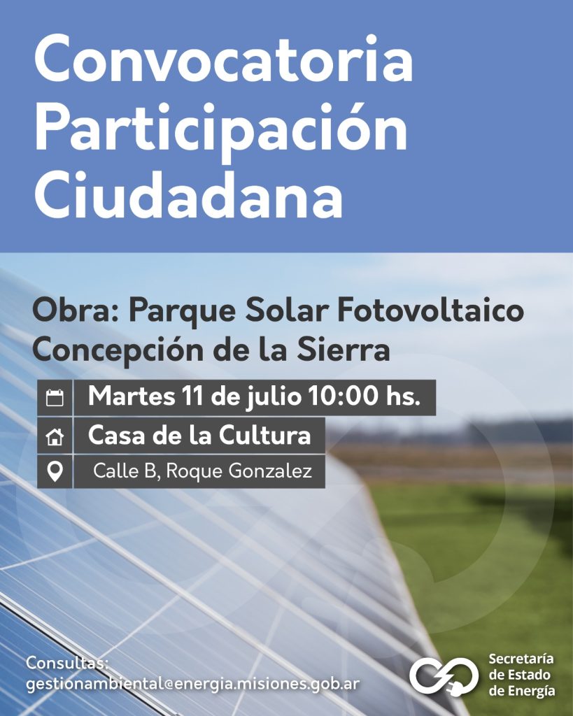 La Secretaría de Estado de Energía, en el marco Parque Solar Fotovoltaico Concepción de la Sierra (N° de Expediente 9910-241/2023 Secretaría de Estado de Energía de la Provincia de Misiones), convoca a la instancia de participación ciudadana que se realizará el 11 de Julio a las 10,00 horas, en la Casa de la Cultura, Calle B, Roque Gonzalez de la localidad misionera de Concepción de la Sierra, cumplimentando lo establecido por la Ley XVI N°35 (antes Ley 3079/93) de Impacto Ambiental.