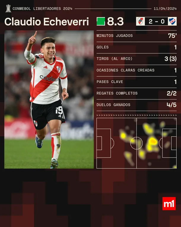 Las estadísticas de Claudio Echeverri en el triunfo de River Plate ante Nacional de Uruguay por la Copa Libertadores