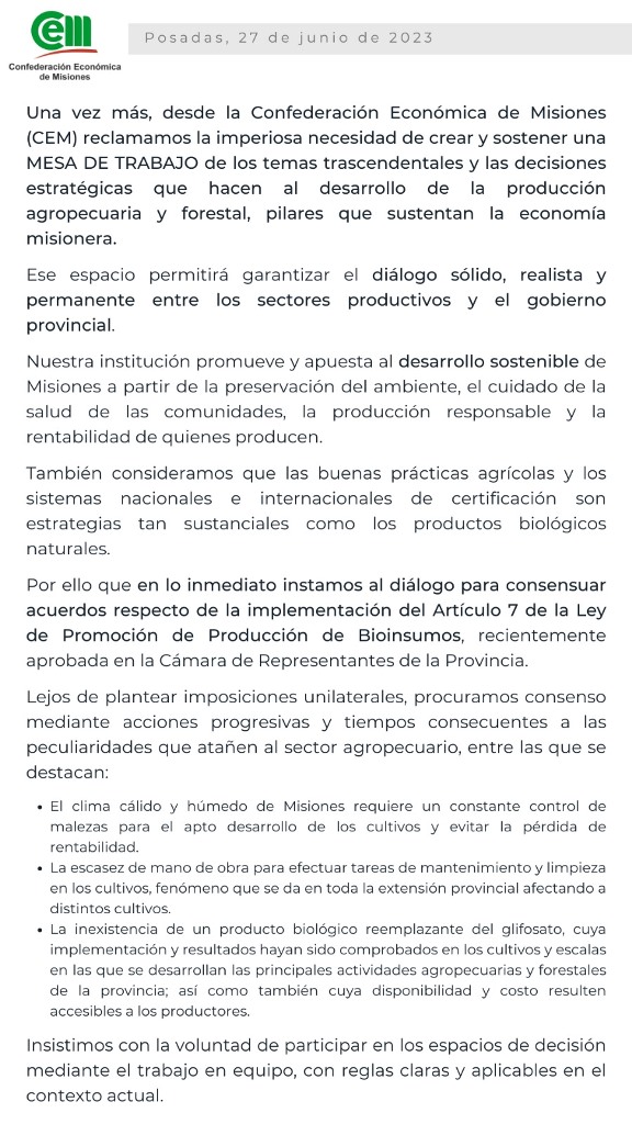 A través de su red social de Twitter, la Confederación Económica de Misiones (CEM) dan a conocer su postura sobre la implementación del Artículo 7 de la Ley de Promoción de Producción de Bioinsumos recientemente aprobada en la Cámara de Representantes de la provincia de Misiones.