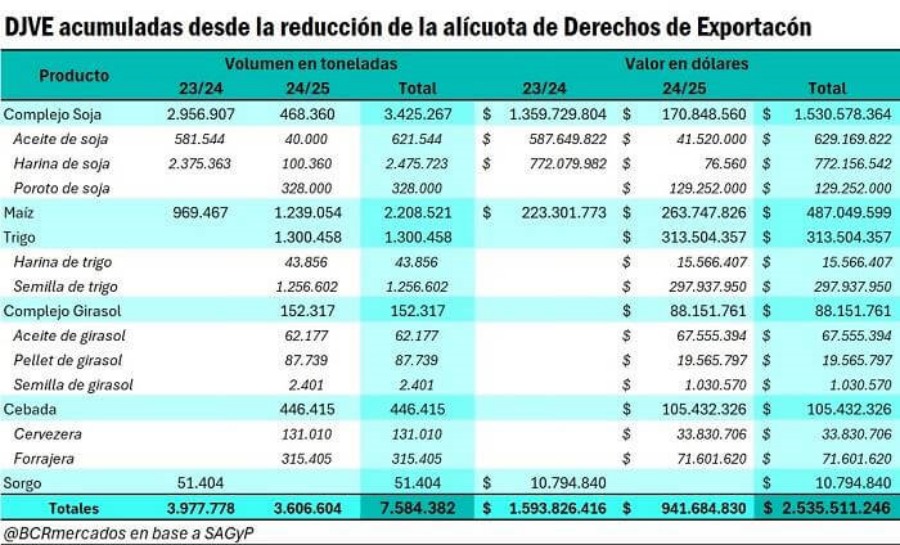 En tanto, otros productos que se destacan son el trigo, con 1,25 millones de toneladas; el aceite de soja, con cerca de 620.000, con 40.000 correspondientes a la próxima campaña; y el poroto de soja, con 330.000 toneladas, todas correspondientes a la 2025/25 que comienza en Abril.