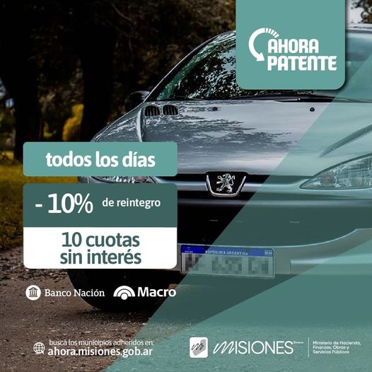 El Programa Ahora Patente, que ya se encuentra funcionando en 37 comunas, tiene por objetivo acompañar a los hogares misioneros en la cancelación del Impuesto Provincial Automotor (IPA). Permite financiar el monto total de cuotas vigentes y deudas en 1, 3, 6 o 10 cuotas sin interés y además recibir un reintegro del 10%.