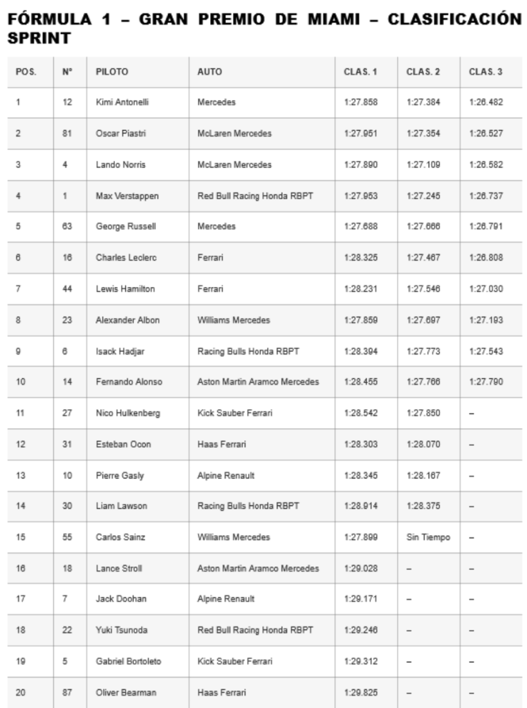 Con aplomo y consiguiendo recorrer los 5.412 metros del circuito urbano de Miami en las trayectorias ideales, Andrea Kimi Antonelli anotó su nombre por primera vez en lo más alto de la tabla de posiciones de una clasificación del campeonato mundial de Fórmula 1 al concretar la mejor vuelta durante la sesión que ordenó la grilla para la carrera Sprint que se disputará este sábado 3 de Mayo a la hora 13,00 de Argentina.