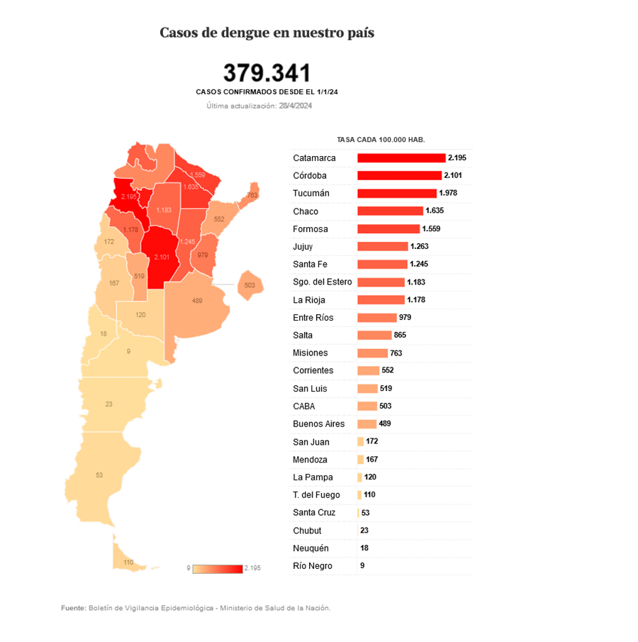 A la vez, las provincias notificaron otros 42 decesos y son, de este modo, 270 las personas que fallecieron en las primeras 16 semanas de 2024. Si, en cambio, se tiene en cuenta el “año epidemiológico” para dengue – de Agosto a Agosto –, en esta temporada 2023-2024 son 280 las personas que murieron por dengue entre las 396.484 que contrajeron la infección desde agosto pasado. El 96% de los diagnósticos (379.341) se documentaron desde Enero pasado.