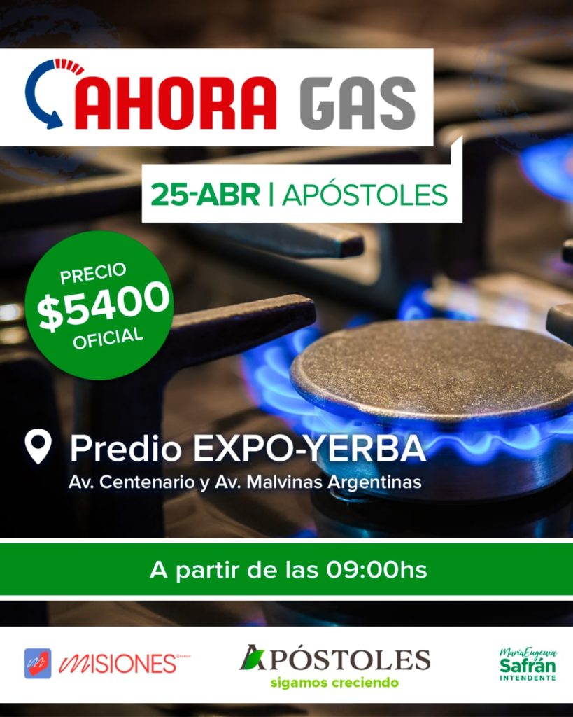 El Programa Provincial Ahora Gas estará el próximo jueves 25 de Abril en el Municipio misionero de Apóstoles, la carga garrafa de 10 kilos al precio de 5.400 pesos