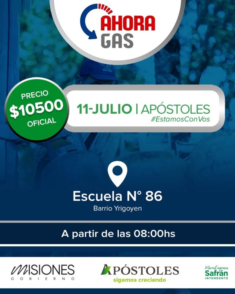 El Programa Provincial Ahora Gas llega a Apóstoles con el Operativo “Estamos con Vos”, será el día viernes 11 de Julio y estará en la Escuela N° 86 del Barrio Irigoyen desde las 8 horas