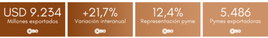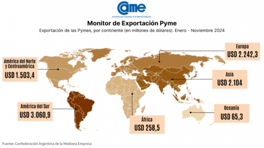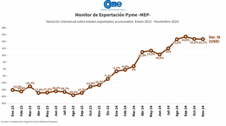Así surge del Monitor de Exportación PyME (MEP) – indicador elaborado por el sector de Estadísticas e Informes de la Confederación Argentina de la Mediana Empresa (CAME) – para medir las exportaciones de las pequeñas y medianas empresas de la República Argentina, en base al monitoreo mensual de las operaciones de las empresas argentinas en el comercio exterior, discriminando por su condición PyME declarada ante la Secretaría de la Pequeña y Mediana Empresa, Emprendedores y Economía del Conocimiento, dependiente del Ministerio de Economía de la Nación.